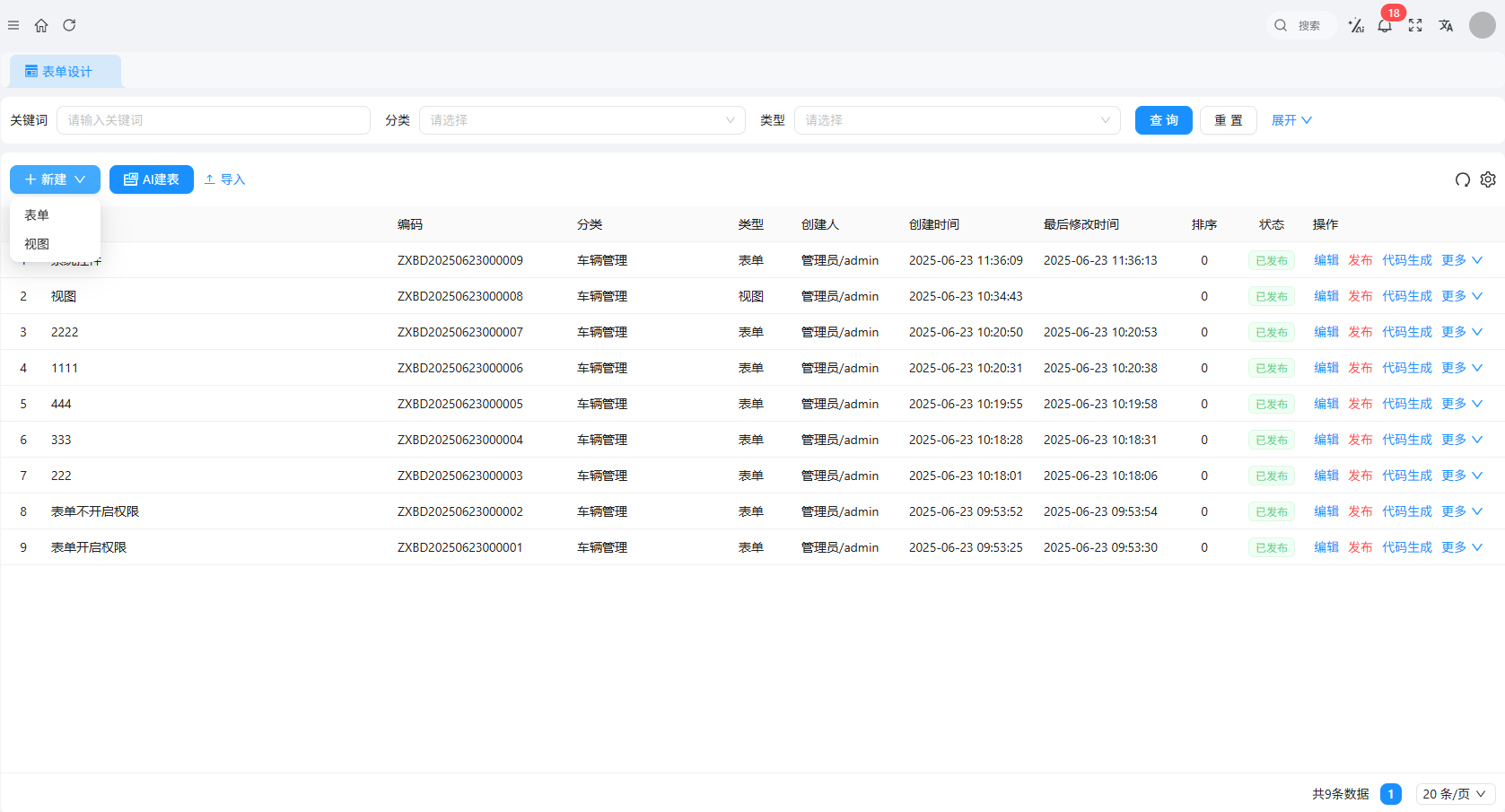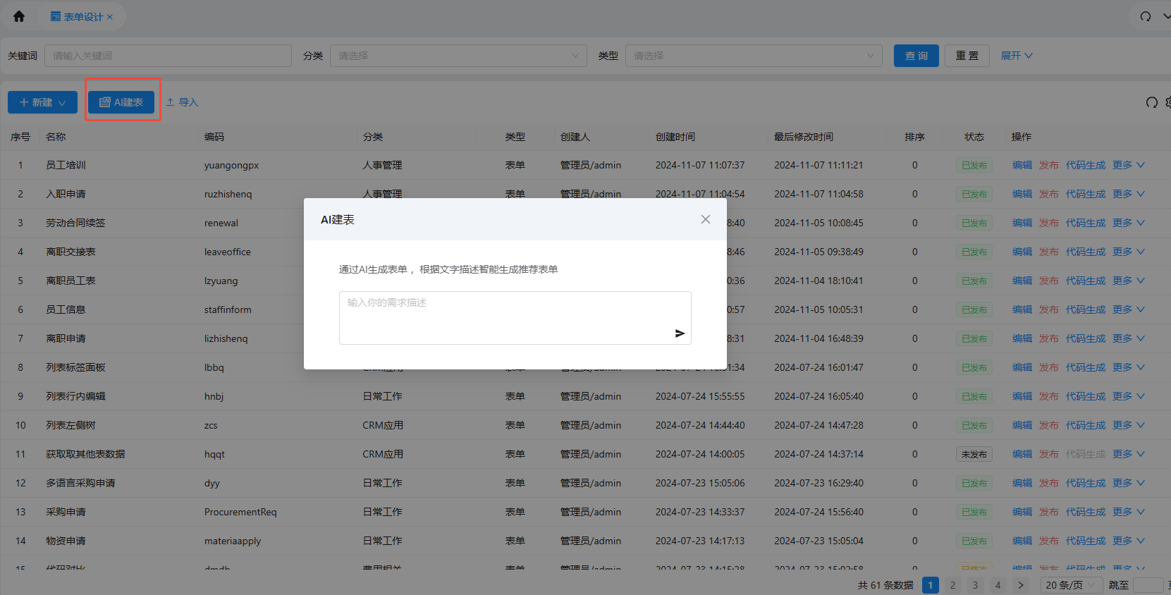 列表里每个表单都有 “编辑、发布、代码生成” 等操作按钮,重点记两个状态:已发布(可正常使用)和未发布(需发布后才能在应用中调用),刚创建的表单默认未发布,记得最后一步点 “发布”。
