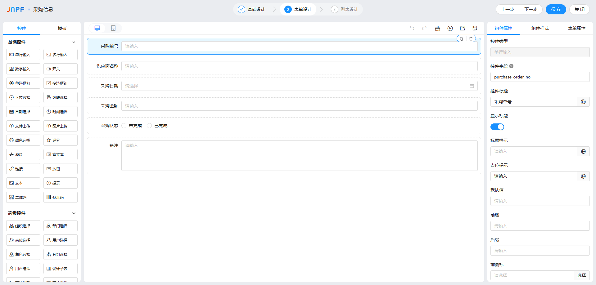 基础控件:单行输入、多行输入、数字输入等,适合简单数据录入;