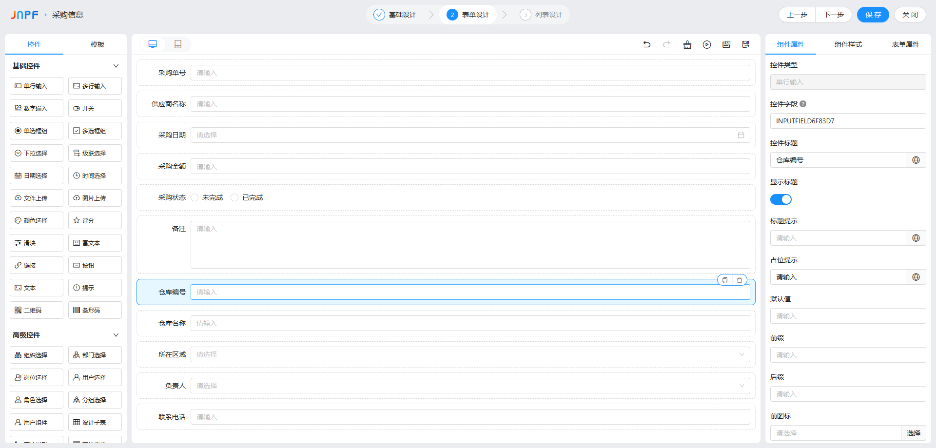 可手动修改字段名称(如把 “仓库编号” 改 “库房编号”)、调整控件类型(如把 “单行输入” 改成 “下拉选择”),属性配置和手动新建一致。