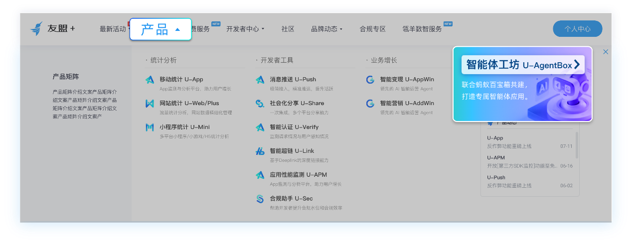 近日,蚂蚁百宝箱与友盟宣布达成深度战略合作,共同推出一款面向开发者的智能体开发与集成平台——U-AgentBox。该平台旨在通过专业级的技术能力与生态支持,帮助开发者以更低成本、更高效率在自有 App 中集成专属智能体,加速业务智能化落地。