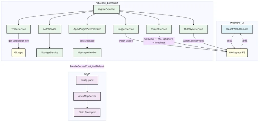 Apex 以插件为主控,Webview 承载 UI 与业务交互,服务层聚合认证、工程上下文、CursorRules 知识库、埋点等能力,MCP 以“配置即工具”的方式进行边界的扩展。实现三端(插件-前端-服务端)通过版本编排解耦 vscode 插件的迭代周期,在安全(鉴权)、可观测(日志与活跃情况)、工程落地(规则知识库与智能体模板)之间取得平衡。