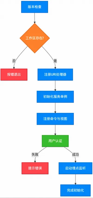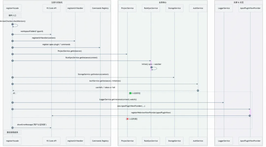 服务单例初始化顺序:ProjectService(工程上下文)→RuleSyncService(规则聚合/监听)→ StorageService(持久能力)→ AuthService.initialize()(异步认证获取 token 与 userInfo)。