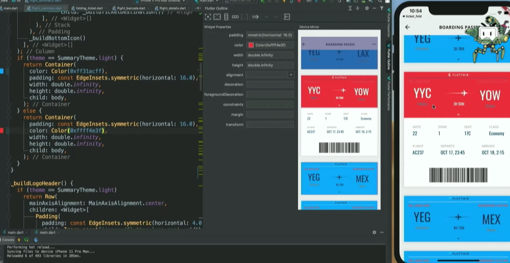 Hot UI 就是大家盼星盼月的预览功能,如下图所示,在 Android Studio 的 Flutter 插件中在开发 widget 开发的过程中,直接在 IDE 的镜像里进行预览并与之进行交互。