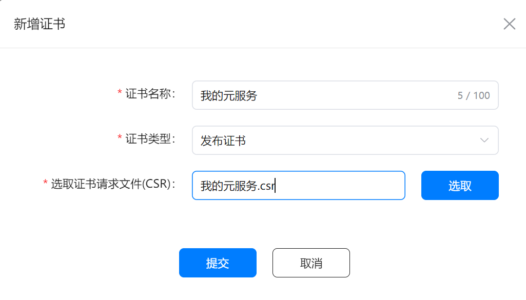 在弹出的“新增证书”窗口填写要申请的证书信息,点击“提交”。