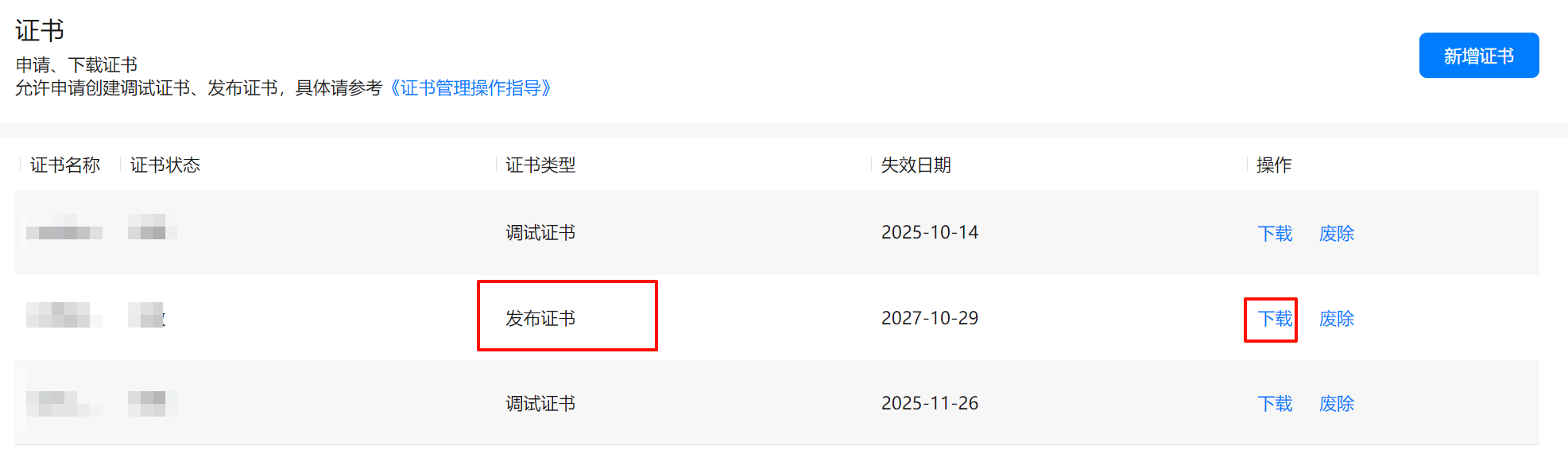 在左侧导航栏选择“证书、APP ID 和 Profile > 证书”,进入“证书”页面,点击“新增证书”。