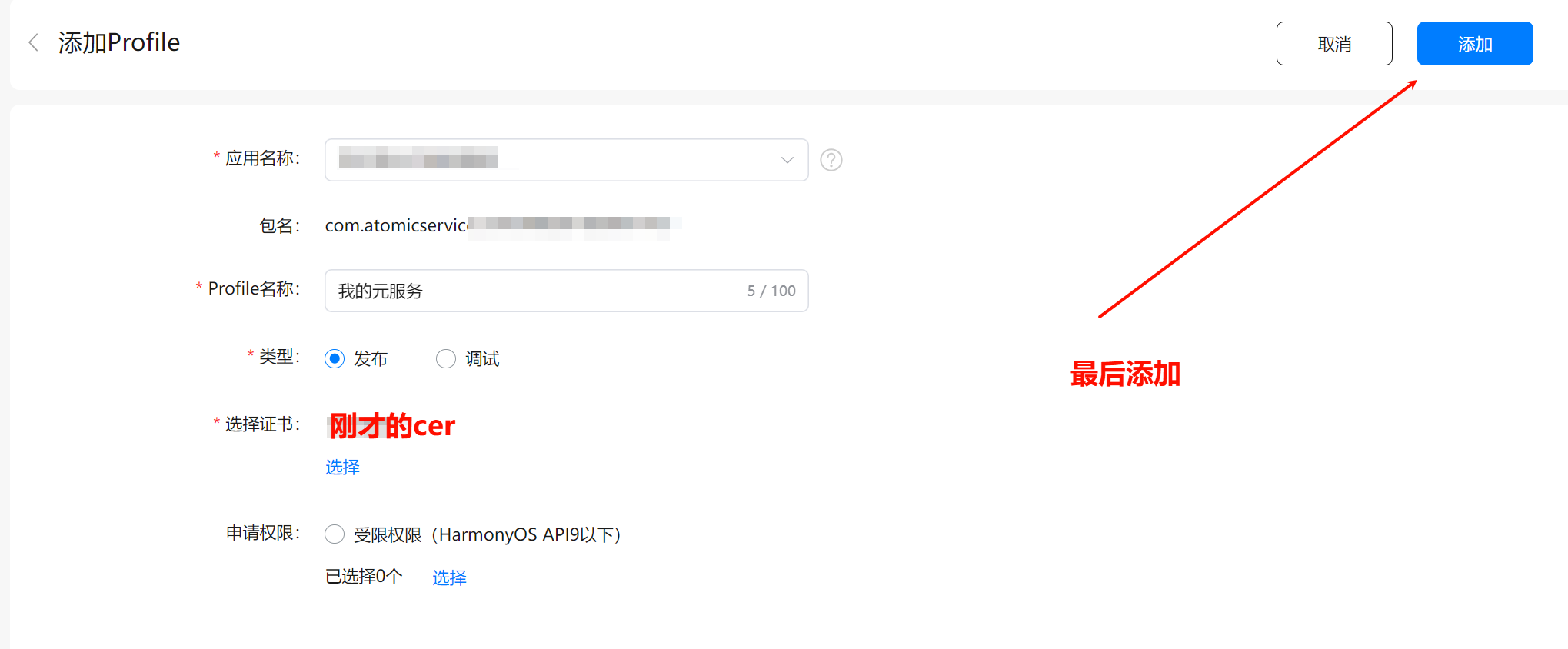 Profile 文件:格式为**.p7b**,包含 HarmonyOS 应用/元服务的包名、数字证书信息、描述应用/元服务允许申请的证书权限列表,以及允许应用/元服务调试的设备列表(如果应用/元服务类型为 Release 类型,则设备列表为空)等内容,每个应用/元服务包中均必须包含一个 Profile 文件。