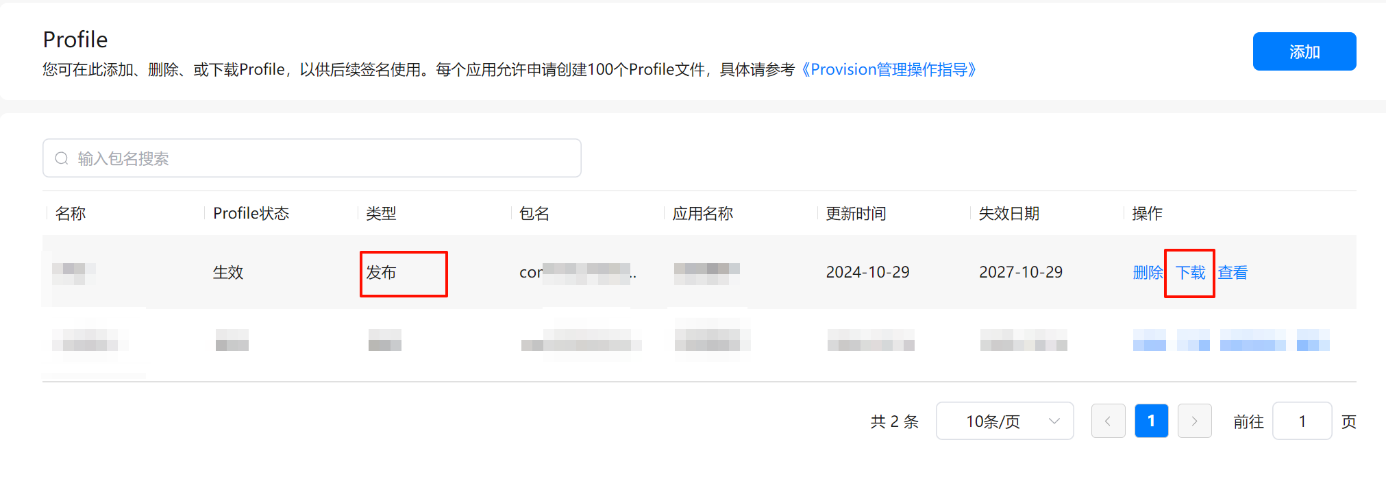 在左侧导航栏选择“证书、APP ID 和 Profile > Profile”,进入“Profile”页面,点击右上角“添加”。