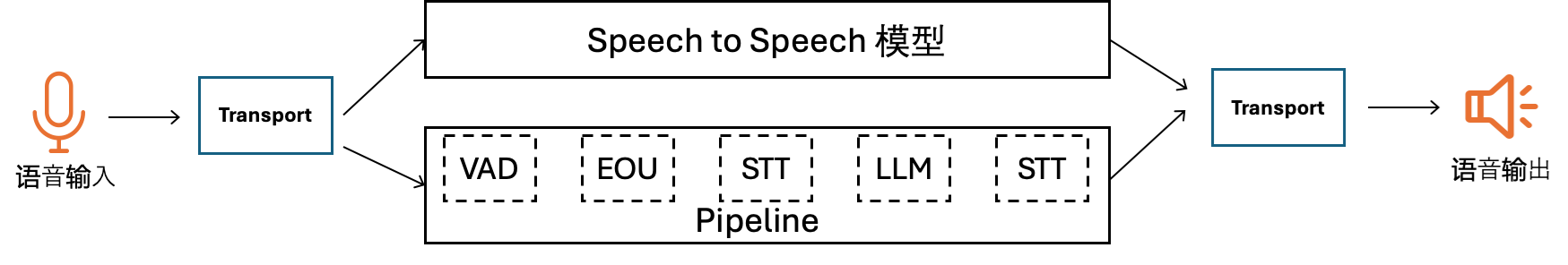 这两种方案各有优缺点:Pipeline 方案可以对各个部分进行精细控制,但其缺点在于语音到文本的来回转换可能导致部分声音信息丢失,并且延迟相对较大。端到端语音模型方案延迟更低,实现更为简单,并且能够更好地感知声音信息,例如非语言线索(如笑声、犹豫)、语调、重音、风格、情绪等,但对语音如何流入和流出 Agent 的控制相对较少。
