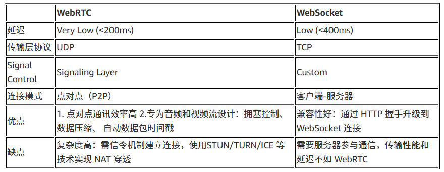 通过对比可以看出,WebSocket 兼容性更好,WebRTC 对音视频的传输做了很多优化,传输效率更高。一般来说,对于构建原型和轻量级项目,可以选择 Websocket,对于中大型生产项目,WebRTC 是更优的选择。但 WebRTC 协议复杂,部署也很复杂,需要实现信令服务器、STUN 服务器(公网 IP 和端口发现),TURN 服务器(P2P 连接失败时作为媒体中继服务器,实现诸如 NAT 穿透)。因此构建一个成熟稳定的 WebRTC 方案,难度比较大。目前市面上有Livekit开源框架,同时也有 Amazon KVS、Daily、Livekit Cloud 等商业 WebRTC 服务可供选择。