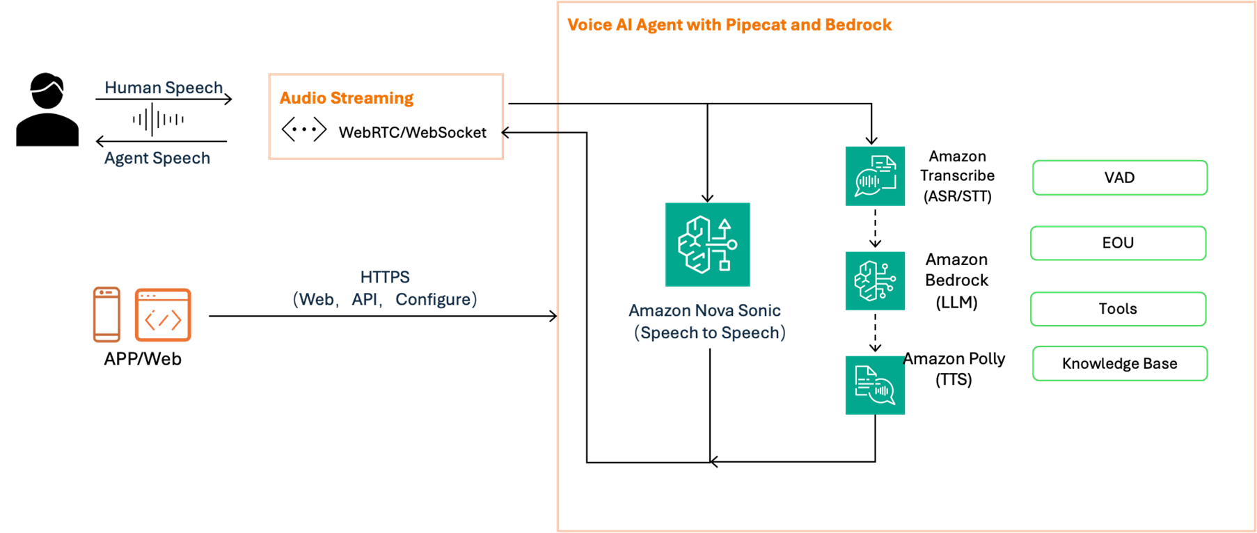 支持 Pipeline 模式和端到端语音模式(使用 Amazon Nova Sonic 模型)。