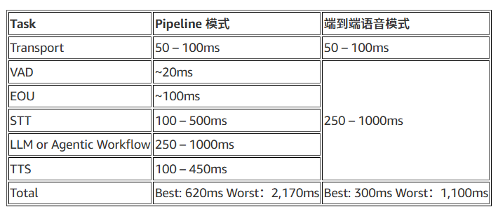 典型的 Pipeline 模式和端到端语音模型延迟对比如下(请注意,不同方案和组件的延迟差异较大,以下数据仅供参考)。在设计智能语音 Agent 时,将语音端到端延迟控制在 800 至 1000 毫秒是一个不错的目标。