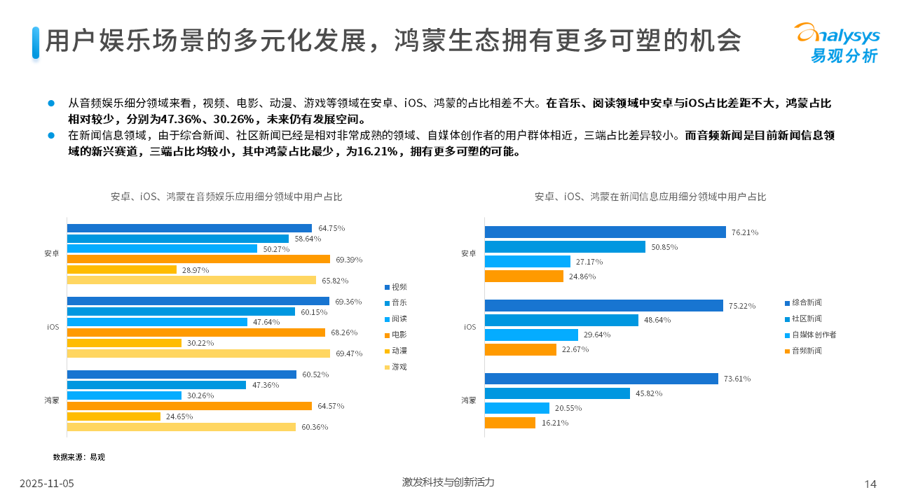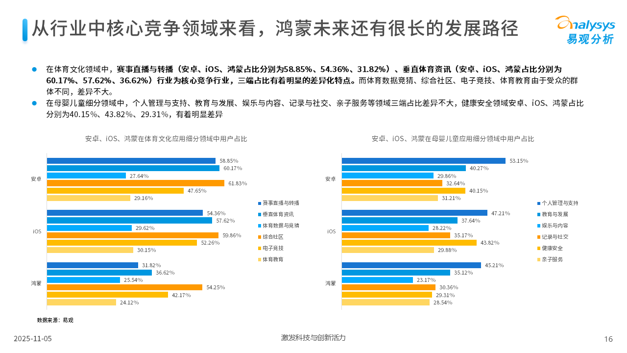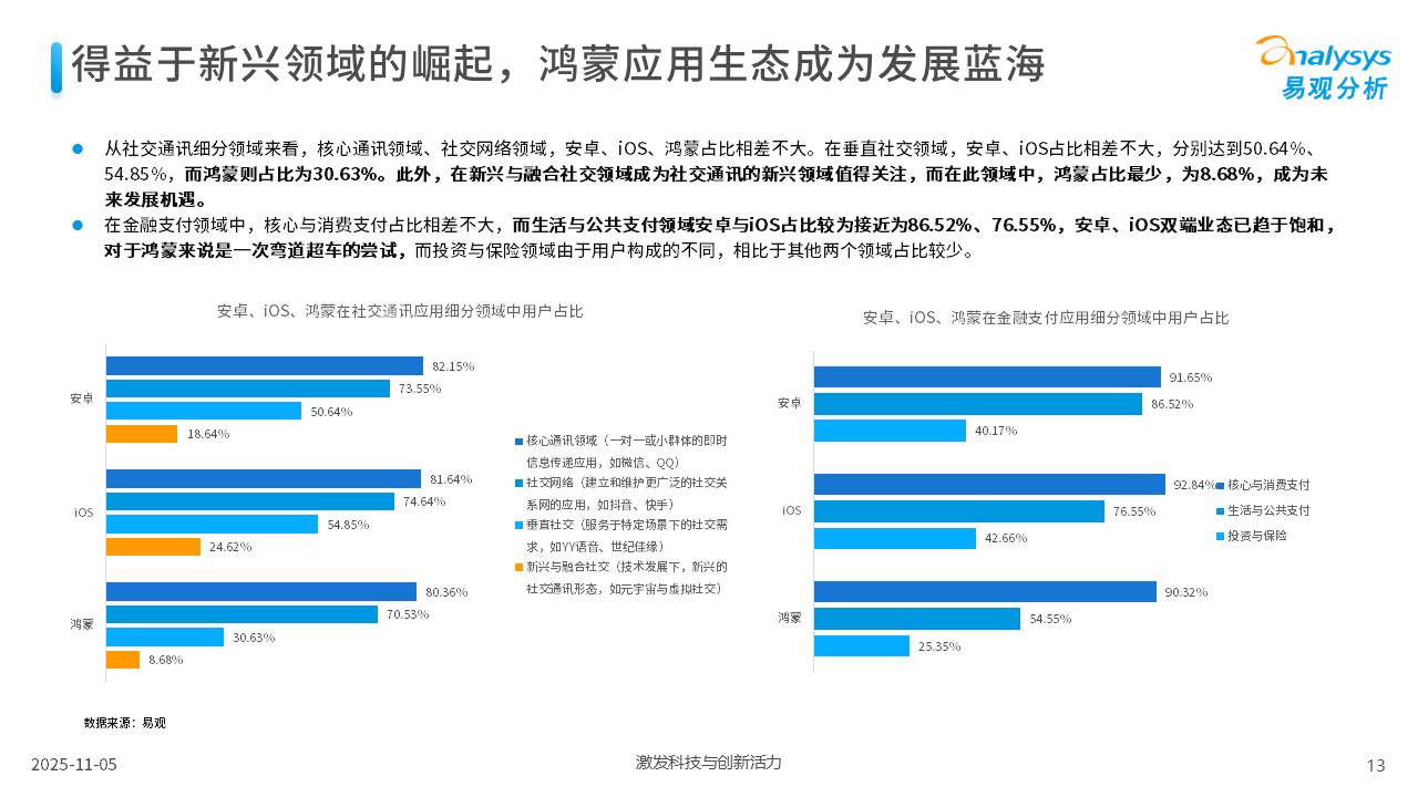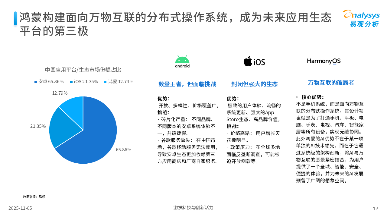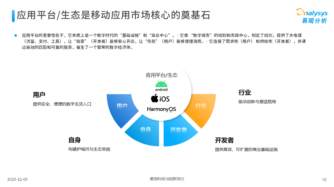 易观分析:中国移动应用市场产业发展规模巨大,应用生态是产业发展的奠基石,当前鸿蒙已经成为应用生态的第三极,适配十大赛道良好有序发展,凭借分布式协同、自主可控技术优势,在多领域效率提升显著,形成差异化竞争力。