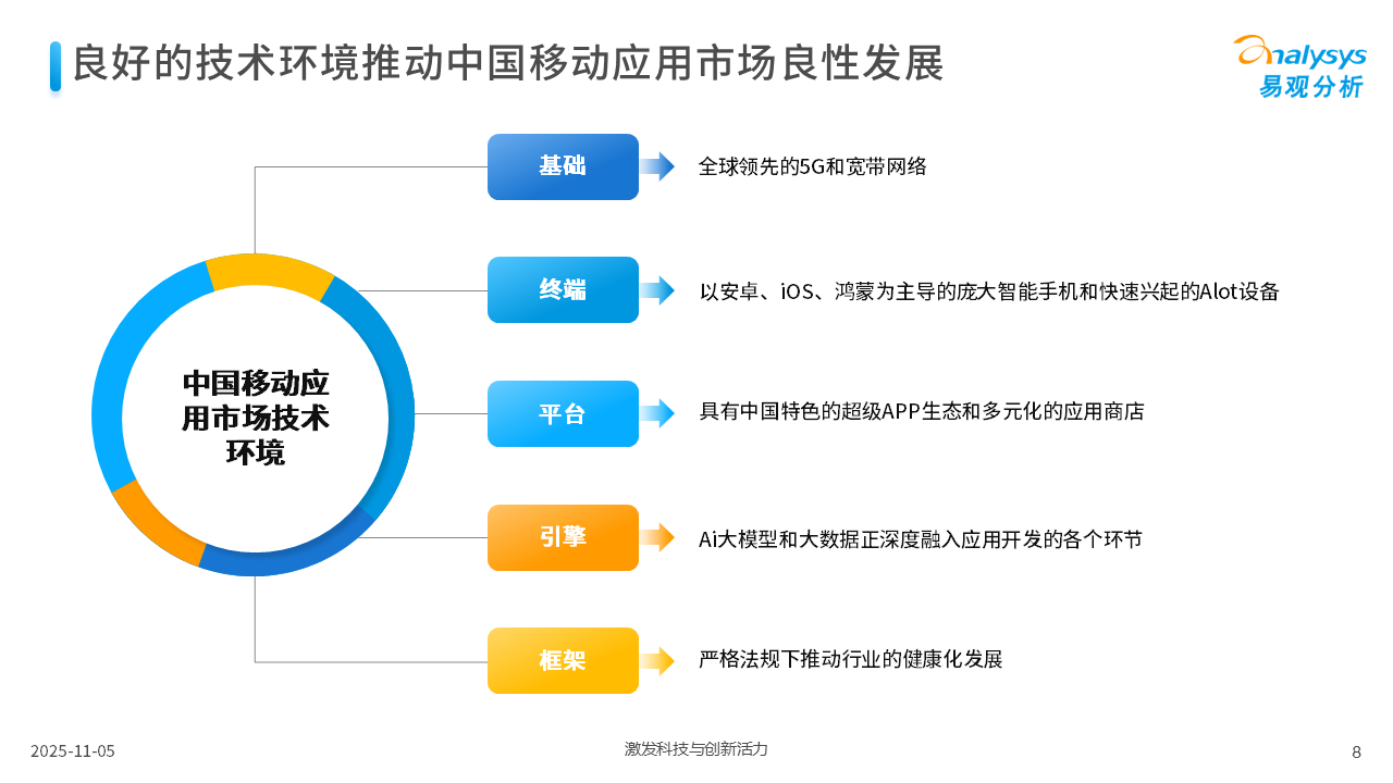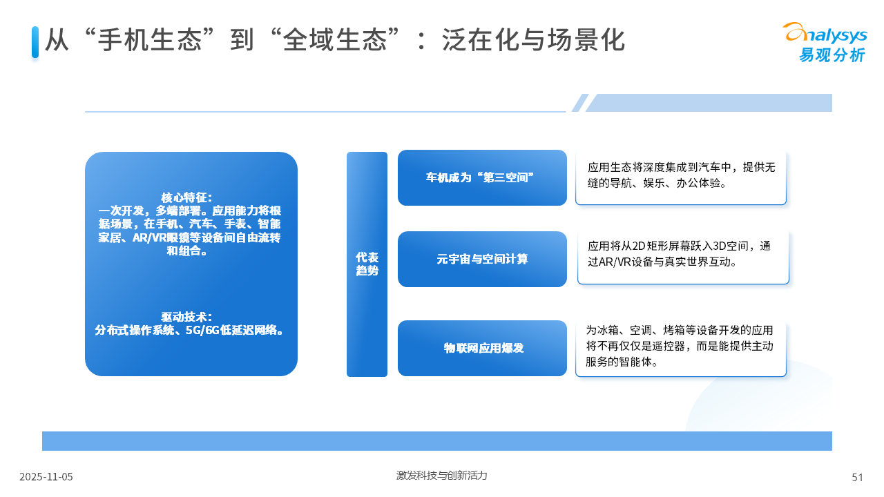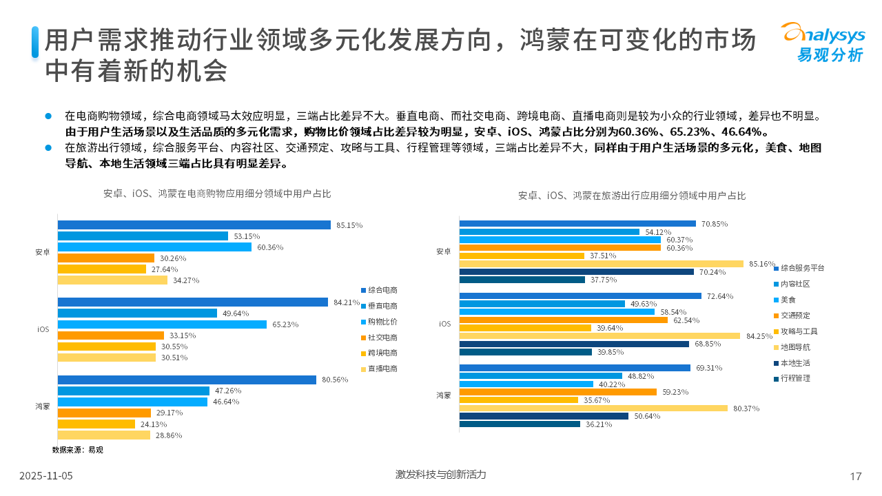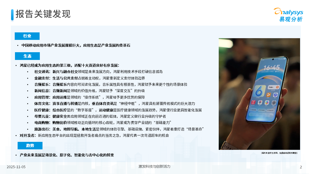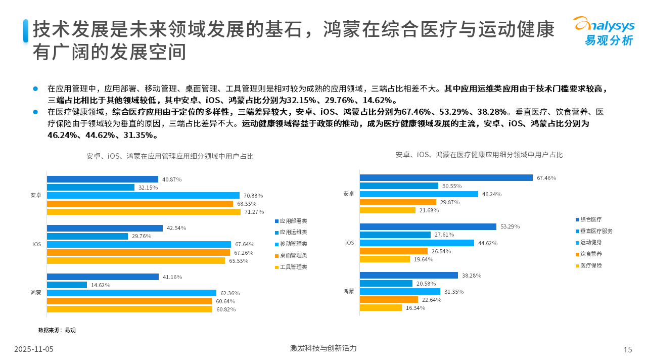 易观分析:中国移动应用市场产业发展规模巨大,应用生态是产业发展的奠基石,当前鸿蒙已经成为应用生态的第三极,适配十大赛道良好有序发展,凭借分布式协同、自主可控技术优势,在多领域效率提升显著,形成差异化竞争力。
