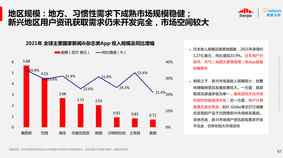 从产品功能性层面来看,新闻资讯整合类 App 更受到用户关注,快速打开如巴西、墨西哥等新兴市场。新兴市场用户付费意愿正在形成,大型报纸等资深媒体依托高质量内容的订阅模式逐渐被更多用户接受,阅读资讯、分享新闻获取现进奖励模式同样为产品推广和用户获取提供支持。