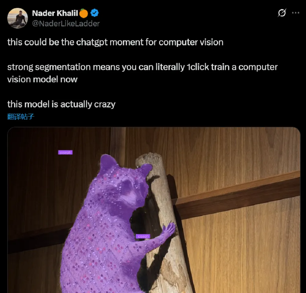 SAM 3 还具有超快的推理速度,在单张英伟达 H200 GPU 上,SAM 3 能在 30 毫秒左右识别一张包含超过 100 个可检测物体的图片。 SAM 3 的发布,让英伟达开发者技术总结 Nader Khalil 直呼:「这可能就是计算机视觉的 ChatGPT 时刻,强大的分割功能意味着用户只要点击一下就能训练计算机视觉模型,太疯狂了。」