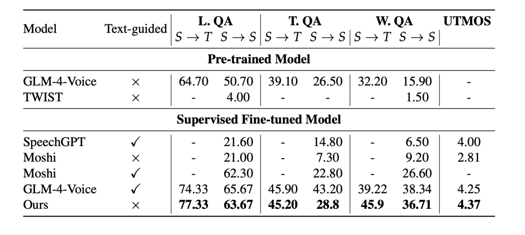 MOSS-Speech 在语音到语音评测指标上取得了 SOTA 成绩。