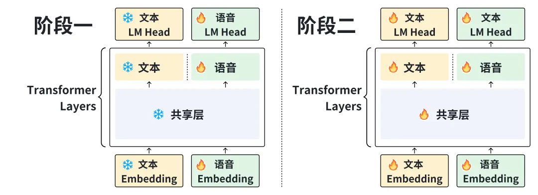 MOSS-Speech 基于预训练文本 LLM,通过模态分层+两阶段预训练,让模型在继承文本 LLM 的推理能力与知识的同时,加入了原生的语音理解与生成能力,有效避免了模态冲突,实现了高效模态对齐。