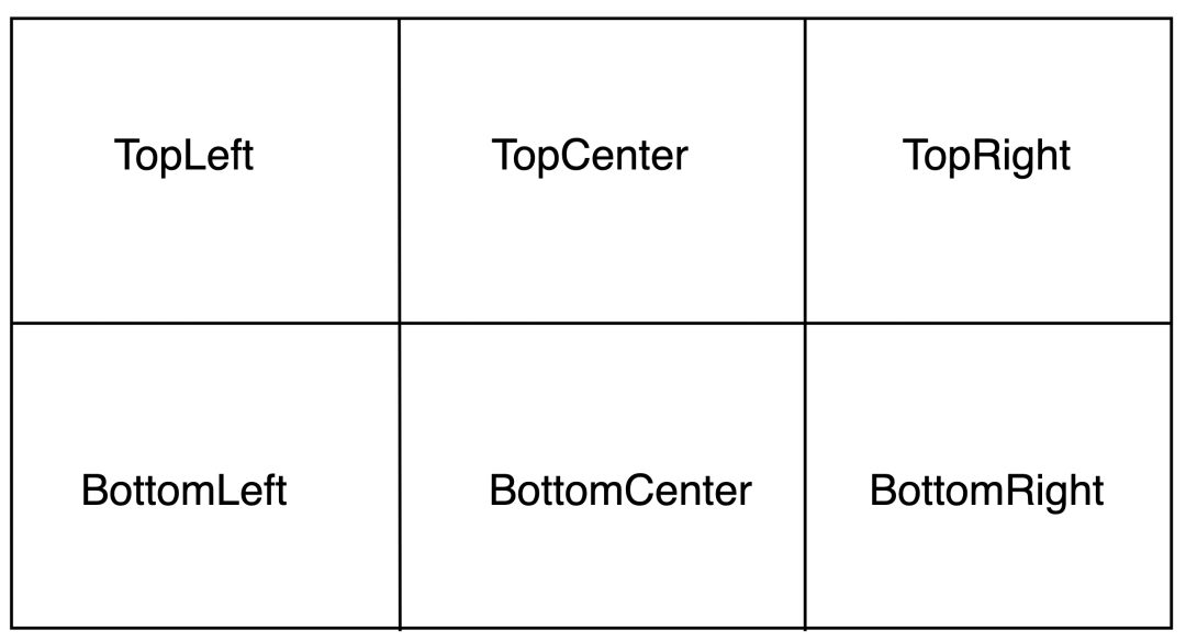 拿到视频帧数据后,我们先将视频帧划分出几个区域。项目中我们是将视频帧画面划分为:TopLeft, TopCenter, TopRight, BottomLeft, BottomCenter, BottomRight 六个区域,如下图所示:
