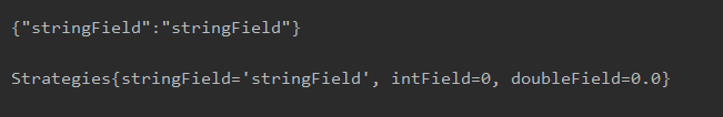 Strategies strategies = new Strategies("stringField", 111, 11.22);System.out.println();System.out.println(gson.toJson(strategies));