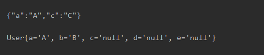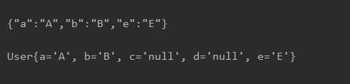 String json = "{"a":"A","b":"B","c":"C","d":"D","e":"E"}";user = gson.fromJson(json, User.class);System.out.println();System.out.println(user.toString());}