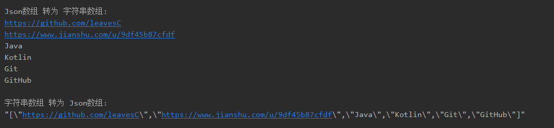 public static void main(String[] args) {//Json 数组 转为 字符串数组 Gson gson = new Gson();String jsonArray = "["https://github.com/leavesC","https://www.jianshu.com/u/9df45b87cfdf","Java","Kotlin","Git","GitHub"]";String[] strings = gson.fromJson(jsonArray, String[].class);System.out.println("Json 数组 转为 字符串数组: ");for (String string : strings) {System.out.println(string);}//字符串数组 转为 Json 数组 jsonArray = gson.toJson(jsonArray, new TypeToken<String>() {}.getType());System.out.println("\n 字符串数组 转为 Json 数组: ");System.out.println(jsonArray);}