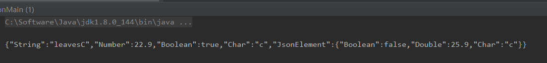 public static void main(String[] args) {JsonObject jsonObject = new JsonObject();jsonObject.addProperty("String", "leavesC");jsonObject.addProperty("Number", 23);jsonObject.addProperty("Number", 22.9);jsonObject.addProperty("Boolean", true);jsonObject.addProperty("Char", 'c');