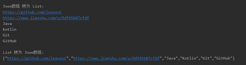 public static void main(String[] args) {//Json 数组 转为 ListGson gson = new Gson();String jsonArray = "["https://github.com/leavesC","https://www.jianshu.com/u/9df45b87cfdf","Java","Kotlin","Git","GitHub"]";List<String> stringList = gson.fromJson(jsonArray, new TypeToken<List<String>>() {}.getType());System.out.println("\nJson 数组 转为 List: ");for (String string : stringList) {System.out.println(string);}//List 转为 Json 数组 jsonArray = gson.toJson(stringList, new TypeToken<List<String>>() {}.getType());System.out.println("\nList 转为 Json 数组: ");System.out.println(jsonArray);}