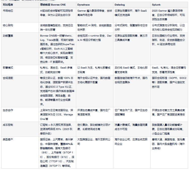 选取全球市场认可度较高的 2 款国外平台(Dynatrace、Datadog)、1 款国际综合厂商平台(Splunk)与全球可观测性领导者产品(博睿数据 Bonree ONE),从技术架构、功能覆盖、合规适配等核心维度展开对比:
