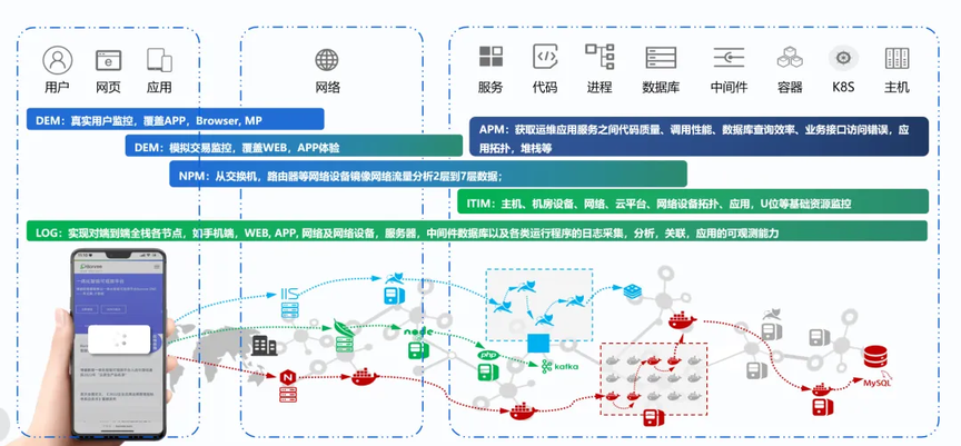 第一阶段 “补全全栈端到端可观测”,整合前端 RUM、后端 APM、NPM、日志数据,实现用户端到服务端全链路数据采集与打通;