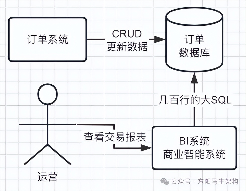 由于目前订单数据库是直接对外暴露的,大数据团队可以直接访问订单数据库。他们有一个数据报表系统,运营每次查看交易报表时,会直接用一个几百行的大 SQL,从订单数据库里查数据。