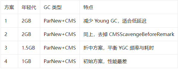 高负载(1100 QPS):方案 3(1.5GB)表现最佳,P99 延时下降 50%,Full GC 累积耗时降低 88%,Young GC 次数下降 23%。