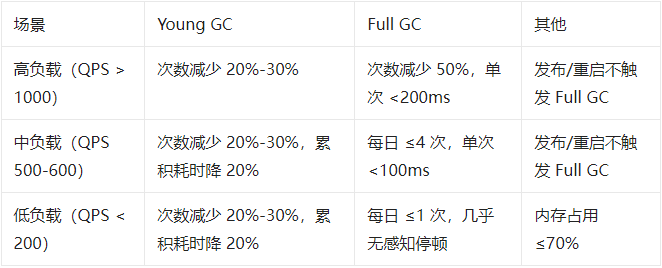 面试提示:阿里常问“压测数据如何指导 GC 调优?”答:通过对比不同方案在高、中、低负载下的 P95/P99、Young/Full GC 次数与耗时,找到平衡点。