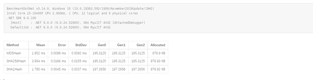 接下来我们对.NET 中常见的三种加密哈希函数:MD5、SHA256、SHA1进行性能基准测试,来一起分析一下哪一种哈希算法性能更优、效率更快。