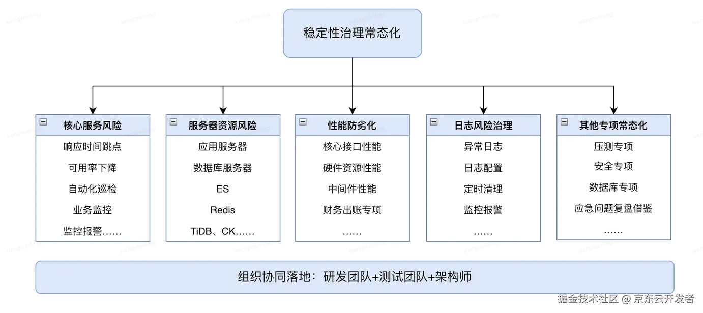 保障稳定性治理常态化,部门组建了一支由研发团队、测试团队、架构师组成的稳定性治理队伍,对部门核心应用,核心服务风险、服务器资源风险、日志风险、性能防劣化、以及技术专项等多维度持续风险识别和治理。