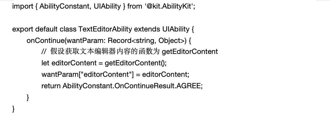 在源端 UIAbility 中实现 onContinue()接口,保存文本编辑器中的内容: