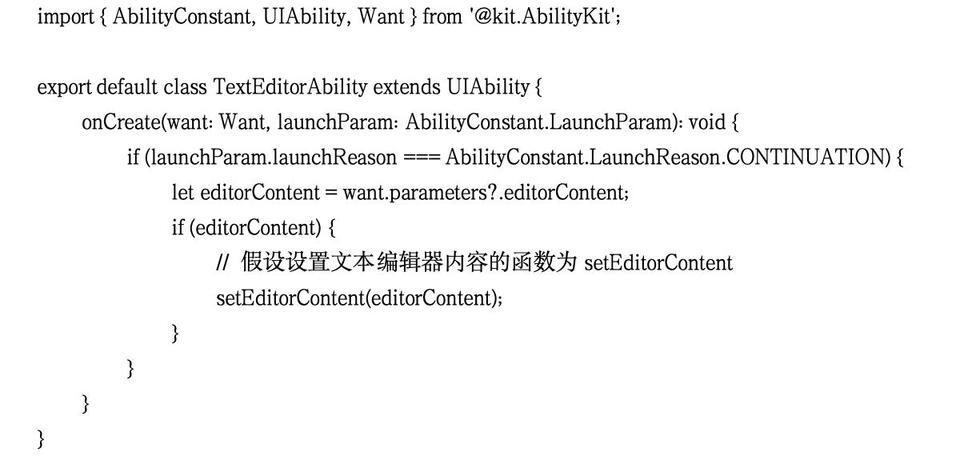 在目的端 UIAbility 中实现 onCreate()或 onNewWant()接口,恢复文本编辑器的内容: