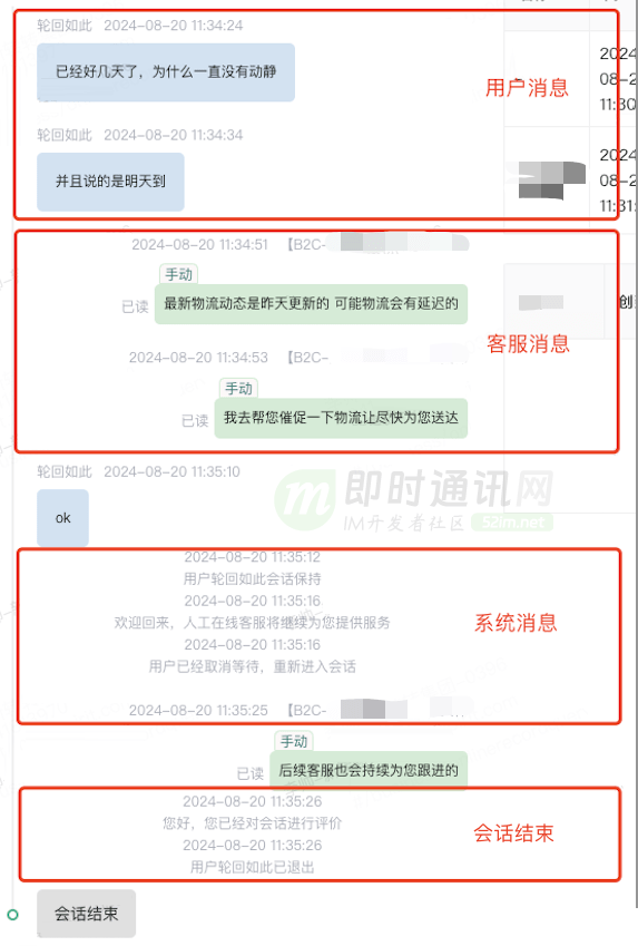 1)消息类型:用于描述消息的用途、流向,如心跳消息、用户/客服消息、系统消息等;