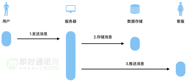 如图是一条消息发送的核心步骤,整个过程中可以分为两个部分,消息由客户端发送到服务端(第 1、2 步),服务端将消息推送至另一个客户端(第 3 步),发送过程中任何一步出现问题都会导致消息发送失败。