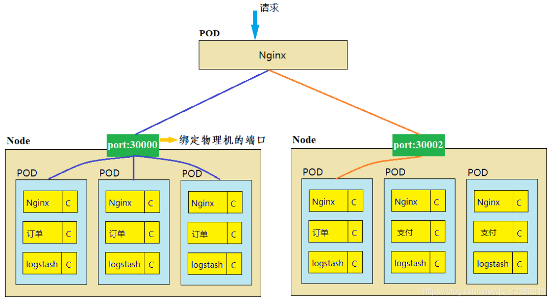 举例:如下图,注意下图右边的 Node 里面有两个是 支付 服务,与订单服务的是不同类型的 pod。如果一个请求订单的服务发来上面那个 Nginx,那这个 pod 可以有 4 条转发路线,可以想到用 hash 呀什么的把不同请求映射到不同的 pod 去转发。但能不能这么做呢?