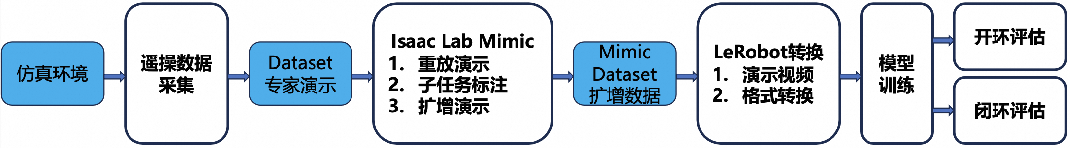 PAI 支持使用 GR00T-Teleop 进行数据采集,使用 GR00T-Mimic 进行数据扩增后,由 Isaac-GR00T 在小数据集上进行微调,并支持在 IsaacLab 中进行效果的评估。