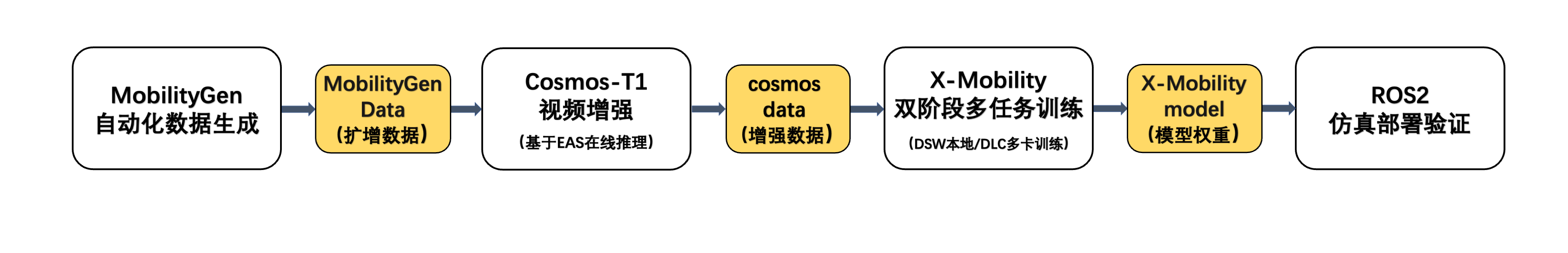 PAI 支持使用 DSW、DLC、EAS 等平台工具和产品,快速使用 Isaac Sim 集成的 MobilityGen 功能,并结合 Cosmos 模型的视觉增强能力,生成大规模演示数据来训练 X-Mobility 这一具有通用性的导航与运动控制策略,并进行端到端可泛化导航。