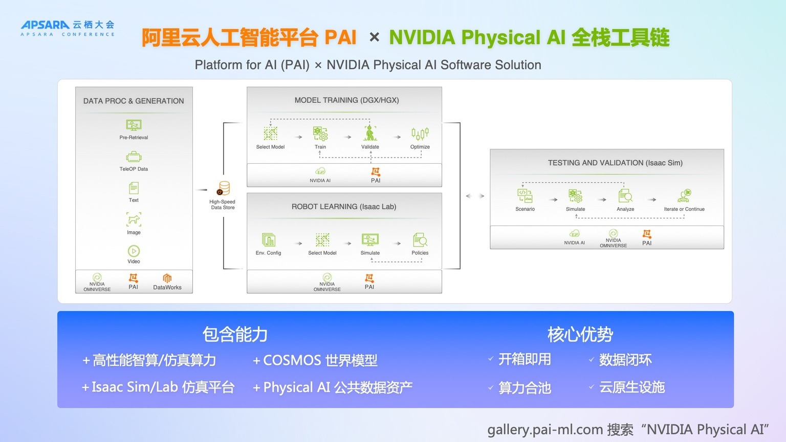 2025 云栖大会上,阿里云与 NVIDIA 宣布合作,PAI 将集成 NVIDIA Isaac Sim、Isaac Lab、NVIDIA Cosmos、Physical AI 数据集在内的 NVIDIA Phsyical AI 软件栈,并结合阿里云在规模化数据计算、高性能 AI 训练推理、大数据 AI 一体化开发等领域的体系化能力,形成覆盖数据预处理、仿真数据生成、模型训练评估、机器人强化学习、仿真测试在内的全链路平台支撑,让 Physical AI 领域开发者充分享受云的弹性与灵活,加速 Physical AI 创新落地。