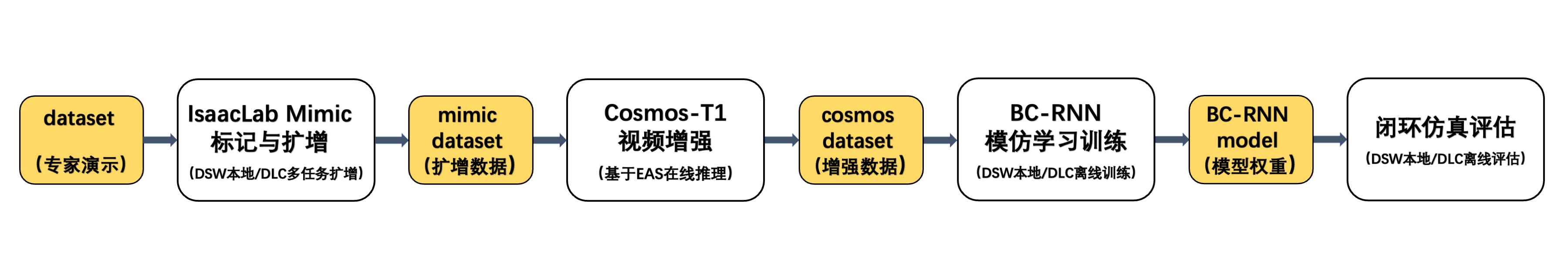 PAI 支持使用交互式建模 PAI-DSW、分布式训练 PAI-DLC、模型推理服务 PAI-EAS 等平台工具和产品,结合 Isaac Lab 的数据合成 &扩增、模仿学习功能与 Cosmos 模型的视觉增强能力,生成大规模演示数据来训练对视觉变化具有鲁棒性的模仿学习策略。