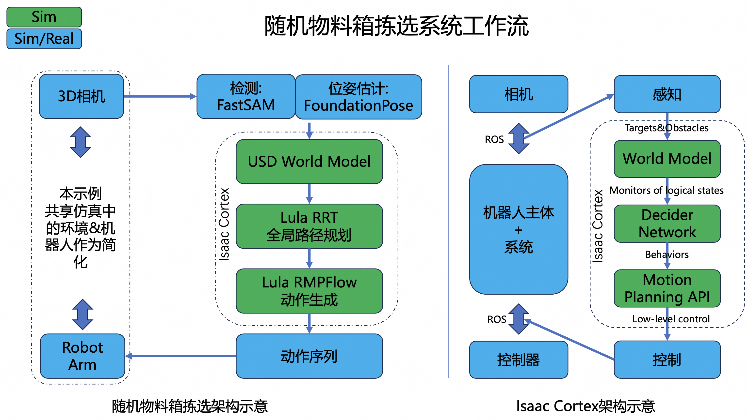 PAI 支持整合使用 Isaac Cortex 和 Isaac Sim 的机器人工具,形成一个统一的协作机器人系统,来实现复杂的交互机器人调度工作,并利用开源算法库 Foundationpose 和 FastSAM 实现快速目标检测及 Pose 估计完成环境感知,基于 Isaac Sim 的 Lula 库实现机器人运动规划和控制,从而完成随机物料箱拣选系统搭建。