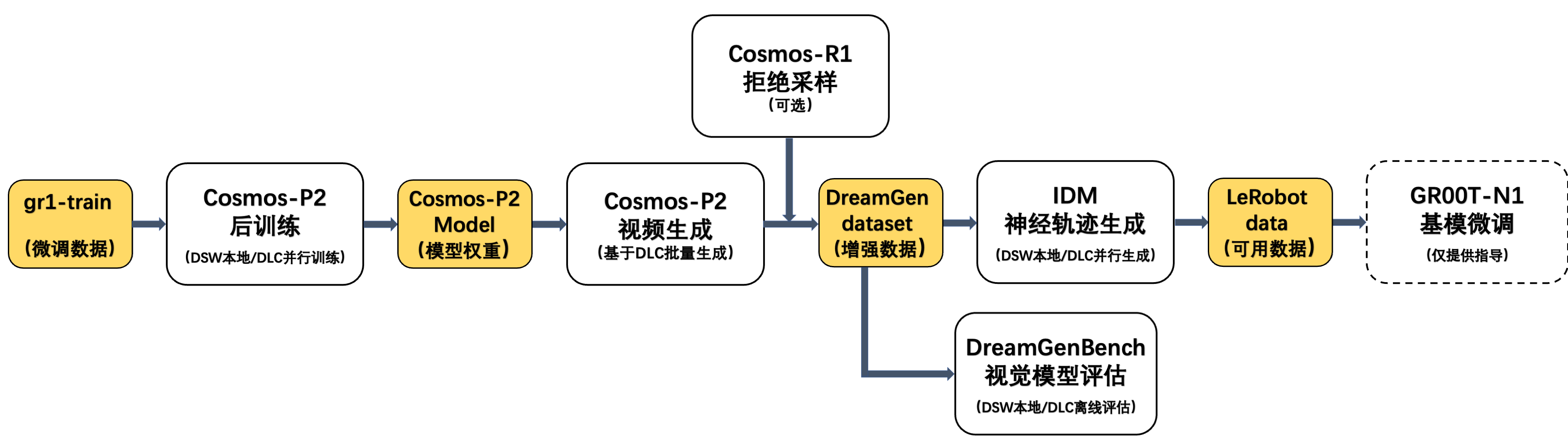 PAI 支持使用 DSW、DLC、EAS 等平台工具和产品,快速使用强大的世界模型 Cosmos-Predict2 生成具有物理真实感的“抓握-放置”演示视频,并结合 GR00T-Dreams 的神经逆运动学模型 IDM,生成对应的机器人动作序列,构成轨迹-视频的完整数据对。基于这些数据对,对 GR00T-N1 模型进行模仿学习,使之具备“抓握-放置”动作的能力。最后,以 DreamGen Bench 作为评测基准,测量模型的物理真实性和指令跟随能力。