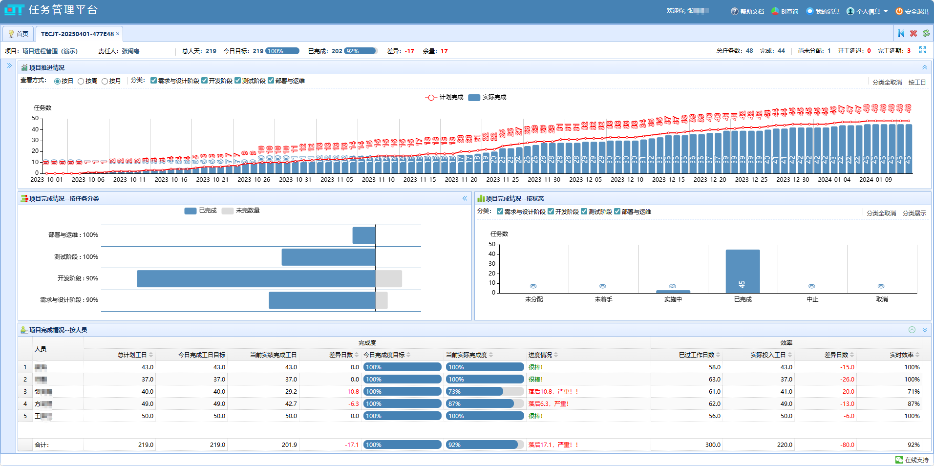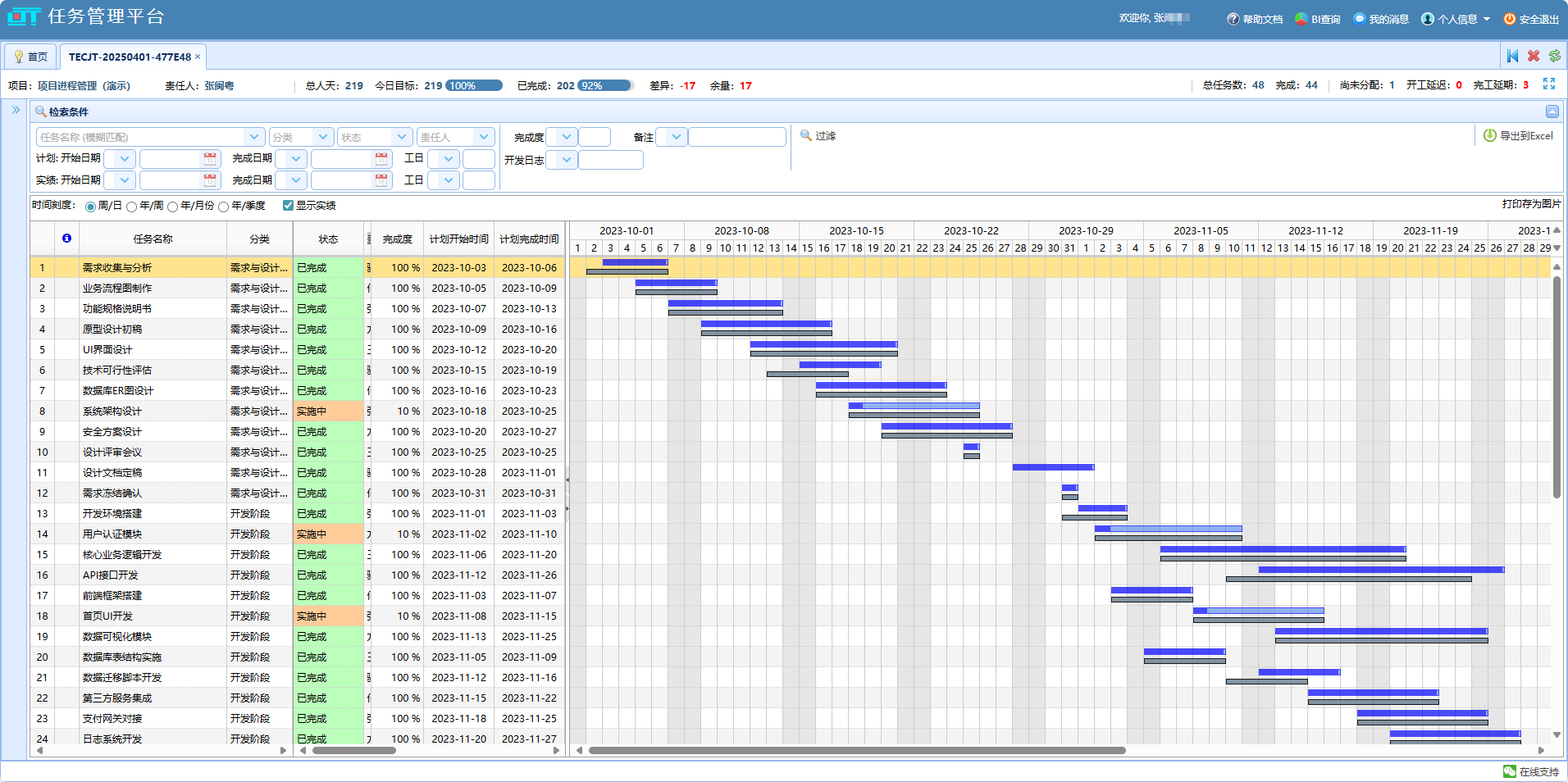 破局思路:PJMan 提供了可视化的项目进度和健康度仪表盘。项目经理可以一目了然地看到整体进度、任务完成率、以及可能的风险点(如:延期任务被高亮显示)。通过设置里程碑和关键路径,系统能辅助项目经理提前识别风险,变被动为主动。