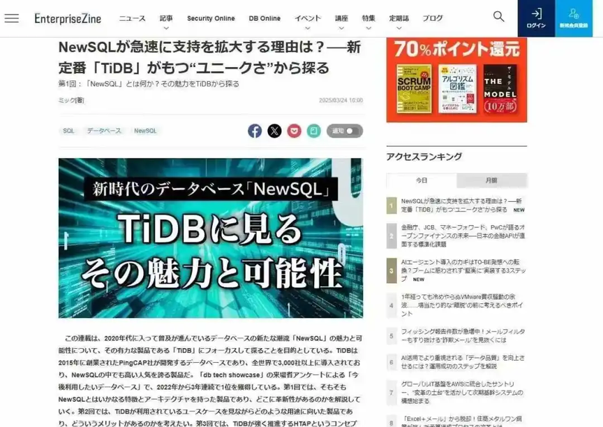 EnterpriseZine 是日本知名的技术媒体平台,专注于企业级 IT 解决方案、数字化转型及创新技术的前沿报道。其读者群体以技术决策者、开发者和企业管理者为主,内容涵盖云计算、大数据、人工智能等核心领域,被誉为日本企业技术选型的“智库”。此次 EnterpriseZine 罕见地以 “新定番”(New Standard)为关键词,开启对 TiDB 的系列连载,标志着中国原生技术产品首次被日本主流技术媒体视为行业标杆,这一动向引发了广泛关注。