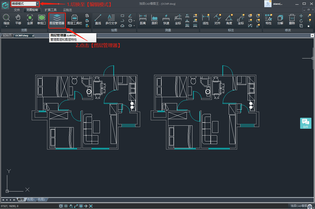 在浩辰 CAD 看图王电脑版中打开需要修改的图纸文件,然后将其切换至【编辑模式】,依次点击【览图绘制】—【图层管理器】。