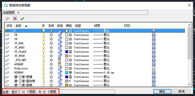 再次打开【图层特性管理器】可以看到当前图纸中共 22 个图层。