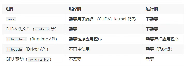 运行时通常无需安装完整 Toolkit:大多数应用程序不需要 nvcc 等开发工具,仅需 libcudart 和 GPU 驱动即可。